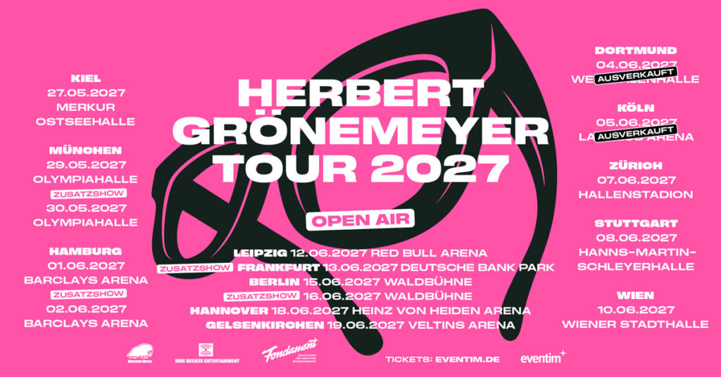 Über den Herbert Grönemeyer Newsletter erhält man die Möglichkeit bereits am Dienstag, den 09. Dezember 2025 ab 10:00 Uhr Tourtickets kaufen. Anmeldung hier https://www.groenemeyer.de/newsletter/ Ein exklusiver Presale für die Herbert Grönemeyers Arena-Tour 2027 startet am Dienstag, den 16. Dezember 2025 um 10:00 Uhr bei CTS Eventim online unter https://www.eventim.de/eventseries/herbert-groenemeyer-arena-tour-2027-3940212/ Der allgemeine Vorverkauf läuft ab Mittwoch, den 17. Dezember um 10:00 Uhr an allen autorisierten Vorverkaufsstellen, bei CTS Eventim online unter https://www.eventim.de/eventseries/herbert-groenemeyer-arena-tour-2027-3940212/ sowie über die bundesweite Ticket Hotline: 01806 – 57 00 70 (0,20 Euro/Anruf aus dem dt. Festnetz, max. 0,60 Euro/Anruf aus dem dt. Mobilfunknetz).